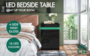 ELFORDSON Bedside Table with 3 Drawers, 4 Sides High Gloss LED Bedside Cabinet with 16 Colours, Side Cabinet Nightstand Bedroom Living Room Furniture, White