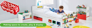 Room 2 Build Display & Store Cabinet This cool, creative Room 2 Build Toy Storage Unit allows kids to create, play and display their building brick creations. Let their imaginations run free and they can create a world of their dreams using the building plates and slots included.The shelves slide easily on and off the storage unit and have a building plate on one side so kids can spend the day building a knight’s castle, a rocket launcher or any other amazing creation, then slot them back into place at night to keep them safe while they sleep. Packed full of features including a slide in slot and building strip on each side and a large fabric storage drawer to keep all their excess bricks safe, the Room 2 Build toy storage unit can easily be moved from room to room and makes life easier when tidying away at the end of a busy day of play. Along with the single bed and toy box the Room 2 Build range incorporates a classic white design with bold colour highlights making it every budding architect’s dream design. Brick building accessories: Brick plates The shelf has removable brick plates which can be flipped over to give a flush finish or flipped back to reveal the construction base of the next big build project. Building strips Building strips and slots are located within the handle feature so you can build in and around the entire piece of furniture. Building slots Slide in a brick to extend the surface area and build the next master piece. 100% Compatible Room 2 Build furniture is compatible with all major building brick brands. Packed with fun features: Also in the range This cool, creative toy box allows kids to create, play and display their building brick creations. They can build a world for all their favourite toys using their own imaginations! Simply slide the lids to remove and start creating building brick master pieces to proudly display. This unique toy box features convenient carry handles with building strips, two slide-in slots for building bricks, plus enough room to store all their building bricks after a busy day of play. Also in the range… This cool, creative Room 2 Build Single Bed allows kids to create, play and display their building brick creations. With its unique headboard with mini figure gallery, and footboard with building strip and slide-in slots for building bricks, kids can have fun creating a bespoke bed showing their true personality! Features include 3 display cubes with removable building plates, mini figure gallery, building strip, two slide-in slots for building bricks, and a handy underbed storage drawer for tidying away their bricks after a busy day of play. Fits a standard UK single mattress (190cm). Mattress not included. Room 2 Build Toy Box Room 2 Build Single Bed Check Offer Price Weight: 11.3 kg Dimensions: 30 x 55.5 x 59.5 cm; 11.27 Kilograms Brand: Room 2 Build Model: 447RTB Colour: White Colour: White