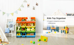 SONGMICS Children’s Toy Storage Unit Playroom Display Stand Unit with 4 Colour Removable PP Container Box with Density Board Frame Stand White 86 x 26.5 x 78 cm (W x D x H) GKR04W