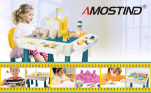 AMOSTING Kids Activity Height Adjustable Table and 2 Chair Set ,include 100Pcs Large Size Blocks Compatible with big blocks. Durable plastic Toy Storage for kids.