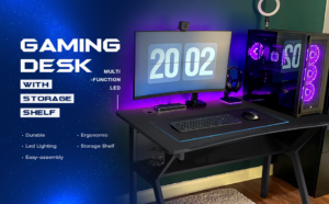 UNIONLINE Gaming Desk 118 x 58 cm Home Office Computer Table with RGB LED Light Strip, Carbon Fiber Gaming Workstation with Power Strip of 2-Outlet & 2 USB Ports, Headphone Hook