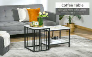 HOMCOM Modern Coffee Table Set of Two, Marble-Effect Nesting Side Tables with Steel Frame for Living Room, White and Black