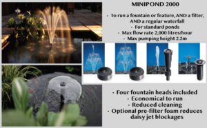 Blagdon the Pond Masters… Leading the way in water gardening Blagdon has a great range of easy to install pond equipment with products to suit every pond, garden and budget. Backed up by extreme reliability and great value for money, Blagdon makes it easy for anyone to create and build winning ponds. You can rely on Blagdon for products for every aspect of your pond, from construction to maintenance. Four sizes available Important information In the UK it is illegal for a manufacturer to supply an indoor use 3 pin plug with an outdoor product. This is because it is believed that supplying an indoor plug for an outdoor product would encourage consumers to use an unsafe indoor plug for an outdoor product. Please see Blagdon Powersafe Switch Boxes or Outdoor Connectors for safe and easy to use outdoor power solutions. Each model comes with a 10 metre cable (no plug) Safety Rating IP68 CE High quality, wear-resistant Blagdon Midipond Pumps are high quality pumps manufactured with advanced technology to run pond fountains and water features. The powerful motors are easy to maintain having a single moving part impeller system featuring highly wear-resistant ceramic shaft design. 3500 – Medium pond. Dimensions (approx.): 2.4m (L) x 1.7m (W) x 0.45m (D) Will run a fountain or feature and a filter in a pond with the max volume of 3582 litres. Will run a fountain or feature and a filter AND a waterfall in a pond with maximum volume 1879 litres. 4500 – Large Pond. Dimensions (approx.): 3.6m (L) x 1.6m (W) x 0.52 (D) Will run a fountain or feature and a filter in a pond with the max volume of 4620 litres. Will run a fountain or feature and a filter AND a waterfall in a pond with maximum volume 3150 litres. 5500 – Large + Pond. Dimensions (approx.): 4.3m (L) x 1.8m (W) x 0.56m (D) Will run a fountain or feature and a filter in a pond with the maximum volume of 5628 litres. Will run a fountain or feature and a filter AND a waterfall in a pond with the maximum volume 4332. 6500 – Extra Large Pond. Dimensions (approx.): 5.3m (L) x 1.7m (W) x 0.61m (D) Will run a fountain or feature and a filter in a pond with the maximum volume of 6668. Will run a fountain or feature and a filter AND a waterfall in a pond with the maximum volume of 5472 litres. Fountain Only (fountain size/max fountain height) Filter Only (suggested max pond volume) Waterfall Only (waterfall width @ 75cm head, medium flow rate) Fountain & Filter (fountain size/max pond capacity) Filter and Waterfall (waterfall width @ 75cm/max pond capacity) Fountain, Filter and Waterfall (waterfall width @ 75cm/max pond capacity) 3500 100cm 5118 ltrs 14cm Small fountain & filter. Pond up to 3582 ltrs 14cm / 2685 litres 10cm / 1879 ltrs 4500 160cm 6600 ltrs 25cm Small fountain & filter. Pond up to 4620 ltrs 25cm / 4500 ltrs 17cm / 3150 ltrs 5500 200cm 8040 ltrs 34cm Small fountain & filter. Pond up to 5628 ltrs 34cm / 6188 ltrs 24cm / 4332 ltrs 6500 240cm 9525 ltrs 43cm Large fountain & filter. Pond up to 6668 ltrs 43cm / 7818 litrs 30cm / 5472 ltrs Check Offer Price Dimensions: 37.6 x 20 x 18.4 cm; 3.16 Kilograms Model: 1050166 Part: 1050166 Manufacture: Blagdon