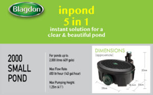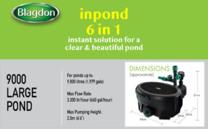 Blagdon the Pond Masters… Leading the way in water gardening Blagdon has a great range of easy to install pond equipment with products to suit every pond, garden and budget. Backed up by extreme reliability and great value for money, Blagdon makes it easy for anyone to create and build winning ponds. You can rely on Blagdon for products for every aspect of your pond, from construction to maintenance. Four sizes available Important information In the UK it is illegal for a manufacturer to supply an indoor use 3 pin plug with an outdoor product. This is because it is believed that supplying an indoor plug for an outdoor product would encourage consumers to use an unsafe indoor plug for an outdoor product. Please see Blagdon Powersafe Switch Boxes or Outdoor Connectors for safe and easy to use outdoor power solutions. Each model comes with a 10 metre cable (no plug) Safety Rating IP68 CE High quality, wear-resistant Blagdon Midipond Pumps are high quality pumps manufactured with advanced technology to run pond fountains and water features. The powerful motors are easy to maintain having a single moving part impeller system featuring highly wear-resistant ceramic shaft design. 3500 – Medium pond. Dimensions (approx.): 2.4m (L) x 1.7m (W) x 0.45m (D) Will run a fountain or feature and a filter in a pond with the max volume of 3582 litres. Will run a fountain or feature and a filter AND a waterfall in a pond with maximum volume 1879 litres. 4500 – Large Pond. Dimensions (approx.): 3.6m (L) x 1.6m (W) x 0.52 (D) Will run a fountain or feature and a filter in a pond with the max volume of 4620 litres. Will run a fountain or feature and a filter AND a waterfall in a pond with maximum volume 3150 litres. 5500 – Large + Pond. Dimensions (approx.): 4.3m (L) x 1.8m (W) x 0.56m (D) Will run a fountain or feature and a filter in a pond with the maximum volume of 5628 litres. Will run a fountain or feature and a filter AND a waterfall in a pond with the maximum volume 4332. 6500 – Extra Large Pond. Dimensions (approx.): 5.3m (L) x 1.7m (W) x 0.61m (D) Will run a fountain or feature and a filter in a pond with the maximum volume of 6668. Will run a fountain or feature and a filter AND a waterfall in a pond with the maximum volume of 5472 litres. Fountain Only (fountain size/max fountain height) Filter Only (suggested max pond volume) Waterfall Only (waterfall width @ 75cm head, medium flow rate) Fountain & Filter (fountain size/max pond capacity) Filter and Waterfall (waterfall width @ 75cm/max pond capacity) Fountain, Filter and Waterfall (waterfall width @ 75cm/max pond capacity) 3500 100cm 5118 ltrs 14cm Small fountain & filter. Pond up to 3582 ltrs 14cm / 2685 litres 10cm / 1879 ltrs 4500 160cm 6600 ltrs 25cm Small fountain & filter. Pond up to 4620 ltrs 25cm / 4500 ltrs 17cm / 3150 ltrs 5500 200cm 8040 ltrs 34cm Small fountain & filter. Pond up to 5628 ltrs 34cm / 6188 ltrs 24cm / 4332 ltrs 6500 240cm 9525 ltrs 43cm Large fountain & filter. Pond up to 6668 ltrs 43cm / 7818 litrs 30cm / 5472 ltrs Check Offer Price Dimensions: 37.6 x 20 x 18.4 cm; 3.16 Kilograms Model: 1050166 Part: 1050166 Manufacture: Blagdon