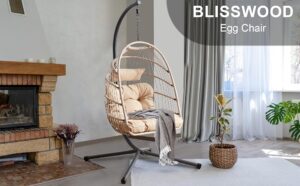 Blisswood Swing Egg Chair, Rattan Hanging Egg Chair With Cushion, Foldable Egg Chair Outdoor Indoor, Garden Patio Hammock Chair With Stand & Adjustable Height, upto 160 Kg Weight Capacity (Natural)