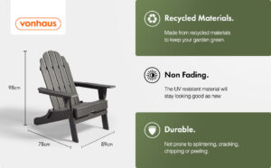 VonHaus Folding Adirondack Chair – Fire Pit Chair Made from Durable All Weather Eco-Friendly Recycled Plastic – Traditional Wood Effect – Outdoor Garden Furniture for Patio, Decking, Lawn – Grey