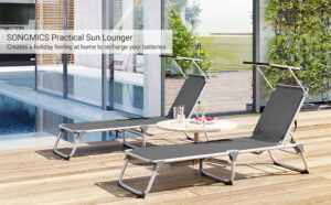 SONGMICS Sun Lounger, Sunbed, Reclining Sun Chair with Sunshade, Adjustable Backrest, Foldable, Lightweight, 55 x 193 x 31 cm, Load Capacity 150 kg, for Garden, Patio, Mottled Grey GCB19TG