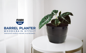 CUQOO 34cm Barrel Planter in Black – Plant Pots Outside Large Planter for Home & Garden – Large Plant Pot Matte Black with Wood Grain Finish – Outdoor Large Plastic Plant Pots Flower Tree Po