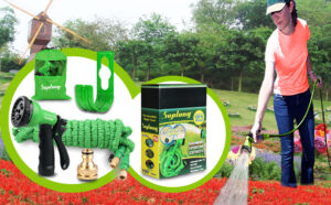 Suplong Expandable Garden Water Hose Pipe – 100FT Magic Expanding Hose with 3/4″ and 1/2″ Brass Fittings Valve 8 Function Spray Gun Nozzle Wall Holder for Watering Plants & Garden Showers (Green)