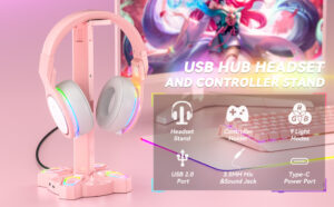 KDD Gaming RGB Headphones Stand, Rotatable Headset Stand with 9 Light Modes – Controller Holder with 2 USB Charging Ports and 3.5mm & Type-C Port – Earphone Hanger Accessories for Desktop Gamer(Pink)