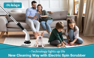 LABIGO Electric Spin Scrubber, with 4 Replaceable Brush Heads and Adjustable Extension Handle, Power Cordless Spin Scrubber for Bathroom Stone Tile Floor,Grout,Grooves(Black)