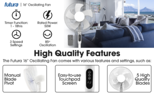 Futura 16″ Pedestal Fan Oscillating Standing Fan Timer Remote Control Adjustable Heigh