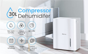 Pro Breeze 30L Smart Dehumidifier with Wi-Fi Smart App Control, Digital Humidity Display, Continuous Drainage and 24 Hour Timer Collects up to 30 litres of moisture per day – Perfect for persistent damp, drying laundry, removing condensation and combating mould in large rooms and spaces. This Smart Dehumidifier from Pro Breeze quickly and efficiently removes damp, mould and moisture from the air. It uses an energy-efficient compressor to remove up to 30 litres of moisture per day and is ideal for use in large spaces with persistent humidity issues. A large 3L water tank ensures continuous moisture collection throughout the day, and a drainage hose is included for optional plumbing into a drain or container for long-term use. The free smartphone app allows you to schedule the dehumidifier to turn on/off or change operating mode according to your schedule. Key Features Extracts up to 30 Litres of moisture per day Large 3L capacity water tank with auto shut-off Digital control panel & free smartphone app Continuous drainage hose included Smart on/off and operating mode scheduling via the app 24 Hour Auto-on and Auto-off timers Automatic humidity sensor (Humidistat) Automatic defrost function Free Smart App with on/off Scheduling Download the free smartphone app and control all operating modes and functions remotely. The free app allows you to schedule the dehumidifier to turn on/off or change operating mode according to your schedule. Large 3L Water Tank with Auto Shut-off This Pro Breeze dehumidifier boasts a large 3 litre water tank. When the unit is full, the sensor will automatically turn off the device avoiding any leaks or spillages resulting from overfilling. A continuous drainage hose is include for continuous operation. Easy-to-use Digital Control Panel View your rooms current humidity level, set a timer for up to 24 hours or change operating mode via the easy-to-use digital control panel or free smartphone app. Turbo mode increases the fan speed for a powerful dehumidifying boost. Easy-roll 4 Wheeled System Four castor wheels are conveniently located on the underside of the dehumidifier to allow for easy moving without having to lift the unit each time. Check Offer Price Weight: 17 kg Dimensions: 39 x 26 x 50 cm; 17 Kilograms Brand: Pro Breeze