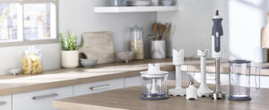bamix 101.221 Deluxe Hand Blender Food Processor Swiss Made Lifetime Guarantee 180 W Motor 11-17000 rpm Two Speed Setting Stainless St Shaft Beater Multi Purp & Whisk Blades (3) Grinder Stand, White