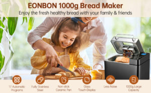 EONBON 17-in-1 Breadmaker with Dual Efficient Heaters, 2LB Stainless Steel Bread Maker Machine with Gluten Free, Nut Dispenser, Nonstick Ceramic Pan&Touch Panel,Recipes,3 Crust Colors,15H Timer,710W