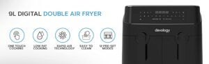 Devology Double Air Fryer – 9L – 2 x 4.5L Independent Cooking Zones – Free 50 Recipe Cookbook- 12 Cooking Programs – Digital LED Display Airfryer – Healthy Oil-free Fryer – Portable Kitchen Appliance