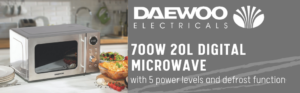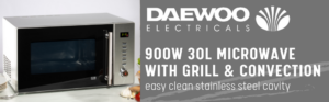 Features: Capacity: 30L Microwave Output: 900W Convection Power: 2200W Grill Power 1250W Plug Type: UK Type G 220-240V 50-60Hz About Daewoo We are continuously developing, innovating and expanding our Daewoo Electricals range to keep providing value to consumers and maintain the Daewoo Electricals name at the forefront of the UK electronics industry. Daewoo 900W 30L Microwave with 1250W Grill & 2200W Convection Soggy meals are a thing of the past with the Grill & Convection settings, perfect for crispy chips. For added piece of mind the inbuilt auto-protection system will automatically revert to standby if the unit gets too hot, cold or short circuits. Easy-To-Clean Stainless Steel Cavity The easy clean stainless steel cavity not only facilitates more even cooking but also prevents any rust build up. Quality Small Appliances Our Daewoo Electricals range offers quality, innovative and affordable products in areas such as small domestic appliances, heaters, fans, audio products and much more. With this 30L capacity this microwave is Ideal for families, large gatherings or large households. Make life easy, with these pre-set functions you can make hassle free meals in no time. Soggy meals are a thing of the past with the Grill & Convection settings, perfect for crispy chips. The revolutionary Jet Defrost setting thaws food in no time, ideal for Seafood, Poultry and Meats. Check Offer Price Weight: 21 kg Dimensions: 45.7 x 30 x 53.9 cm; 20.99 Kilograms Brand: Daewoo Part: SDA2094 Colour: Koc9c5t Batteries Required: No Colour: Koc9c5t