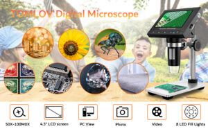 TOMLOV DM4 digital Microscope 50-1000X, 4.3'' LCD Microscope with Metal Stand for Kids|Adults|Students Coin/PCB/Plants observe, Supports Windows (32GB Card)