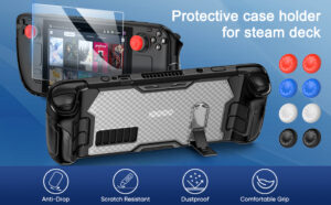 Protective Case for Steam Deck with Built-in Adjustable Kickstand, Upgraded Soft TPU Cover Case with Screen Protector & 8 Thumb Grips for Steam Deck Accessories, Anti-Scratch and Shock-Absorptio