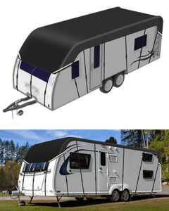 RV Caravan Cover Waterproof, Universal 210D Oxford Cloth Caravan Roof Cover, Breathable Motorhome Top Cover Frost UV Protector Tarpaulin with Retractable Straps for Camper Travel (7.5 x 3M)