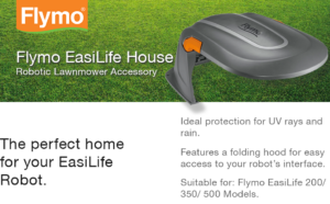 Flymo – Leading experts in Lawn Robotics for over 25 years Protect your Flymo EasiLife robotic lawnmower and charging station from the effects of weather and direct sunlight. The EasiLife House provides your robotic lawnmower with an all-weather protected home – allowing it to charge in a protected environment. This practical house has an opening hood, allowing you to have access to the control pad on the robotic lawnmower and is simple to install. Provides ideal protection against all weathers. Easily accessible for quick programming from the control panel. Is easy to assemble and attaches over the charging station. Suitable for: Flymo EasiLife Models. Features Easy Cable Access It’s easy-access cable opening means that you won’t need to remove the Robotic House to access the charging port’s cables. Weather Protection Protects your Flymo EasiLife from the effects of UV Rays and rain. Easy Installation Only needing two screws to secure, the Robotic House is easy to install and remove. Easy Access Hood Opening It’s foldable hood gives you easy access to the manual controls of the EasiLife Robot. A part of the Flymo EasiLife accessory range Flymo EasiLife 200 ✓ ✓ Flymo EasiLife 350 ✓ ✓ Flymo EasiLife 500 ✓ ✓ Flymo 1200R X X Check Offer Price Weight: 10 kg Dimensions: 70 x 55 x 45 cm; 10 Kilograms Model: 597656501 Part: 597656501 Pack Quantity: 1 Batteries Required: No Manufacture: Husqvarna Group Ltd Quantity: 1