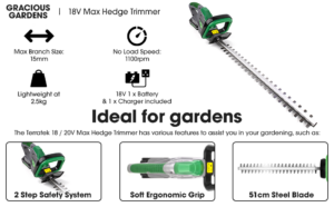 Gracious Garden 18V Cordless Electric Hedge Trimmer, 51cm (510mm) Cutting Length, Easy cut Pro Lightweight Garden Handheld Cutter, Includes Battery, Charger and Safety Blade Guard