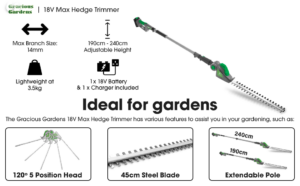 Gracious Gardens 18V Cordless Electric Hedge Trimmer Long Reach Lithium-Ion 2.4m Telescopic Extendable Pole 45cm Cutting Length, 5 Positions for Tall Hedges, Battery Powered (1 x Battery)