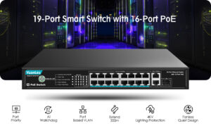 YuanLey 16 Port PoE Switch with 2 Gigabit Ethernet Uplink, 1 SFP Port, 200W PoE+ Port Support 802.3af/at, Unmanaged Network Switch with AI Watchdog, VLAN, Extend to 300m, Fanless and Silent Operatio