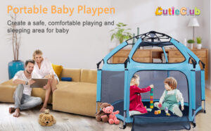 Baby Playpen, CutieClub Portable Playard Playpen with Safety Mattress for Infants and Babies, Best 6-Panel Kids Playpen with Anti UV Canopy for Indoor and Outdoor (Turquoise)