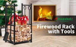 Amagabeli Fireplace Log Rack with 4 Tools 28.3”x15.8”x11.7” Indoor Fireside Companion Set Outdoor Log Holder for Wood Burner Wrought Iron Log Storage Tool Set Wood Stove Fireplace Accessories