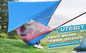 UTEBIT Hammock Outdoor, Travel Hammock with Mosquito Net 200KG Load Capacity and Waterproof Tarpaulin, Light Breathable Hammock for 2 Persons, for Camping, Travelling, Hiking (260*140 cm, Pink&Blue)