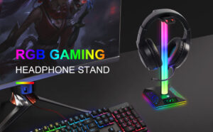 Hcman RGB Gaming Headphone Stand, Headset Holder Rack for PC Gamer, LED Lighting Effect Desktop Gaming Accessories with 2 USB Ports, Black