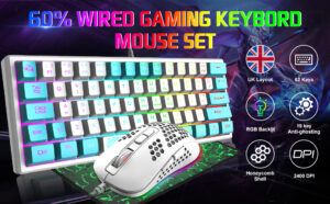 K61 UK Layout RGB 60% Gaming Keyboard Mouse Set Wired 62 Keys Mini Portable Keyboard 7 RGB LED Backlit 19 key Anti-ghosting + 2400 DPI Ultralight Gaming Mouse Honeycomb Shell +Mouse Pad -White Mixed