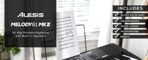 Alesis Melody 61 Key Keyboard Piano with Built-In Speakers, Headphones, Microphone, Piano Stand, Music Rest and Stool