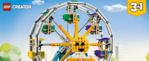 Ferris Wheel 3 times the fairground fun with LEGO bricks Kids can enjoy 3 different build-and-play fairground experiences with this stunning playset. They can build a rotating Ferris Wheel, then use the same bricks to make a bumper car playset or turn it into a swing boat ride. Packed with features Rotating Ferris Wheel The Ferris Wheel can be moved in both directions by turning a small handle. Enjoy a fun ride 8 gondolas for fairground fun Ferris Wheel has 8 gondolas with opening doors so minifigures can ride inside. Go for a fun drive! Bumper car adventures Kids can act out all-action stories with 4 bumper cars that fit minifigures. Fairground thrills Swing boat ride 3 swing boats can rock back and forth to grip kids’ imaginations. Fun LEGO characters 5 minifigures Set includes a mom, dad, kid and 2 fairground workers, plus a brick-built dog. 1 Ferris Wheel 2 Gondolas 3 Bumper cars 4 Swing boats 5 Minifigures