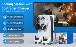 OIVO PS5 Stand with Cooling Fan and dual PS5 Charging Station with Headphone Stand in Mini Size for Playstation 5 PS5 Console, Space Saving PS5 Fan with PS5 Controller Charger and 10 Game Storage