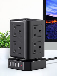 Tower Extension Lead with USB Slots, [3250W/13A] 10FT Extension Cable, Surge Protected Extension Lead with 8 AC Outlets & 4 USB Ports, USB Extension lead for Home, Office, Kitchen, Black