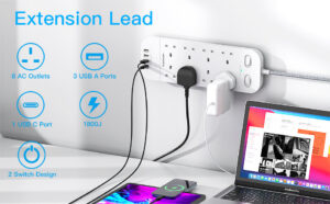 Extension Lead with USB Slots, 8 Way Outlets 4 USB(1 USB-C and 3 USB-A Port), Power Strip with 1800J Surge Protection and 1.8M Braided Extension Cord, Plug Extension Socket for Home, Office, Dorm