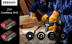 ESSGOO Cordless Drill Driver 21V with 2 Batteries 1500mAh, 45Nm Max Electric Drill,3-Function Combi Drill and Screwdriver Set, 25+3 Torque Setting, 3/8inch Chuck, 2 Speed, LED Light…