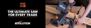 Evolution Power Tools R210SMS+ Sliding Mitre Saw With Multi-Material Cutting, 45° Bevel, 50° Mitre, 230mm Slide, 1500 W, (110 V Industrial Plug)