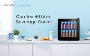 COMFEE’ RCZ46BG1(E) 43L Beer Fridge with Glass Door, Beverage Refrigerators with Removable Shelves, Beer Fridges for Home Bar, Eco Energy, Fire Retardant Backing – Black [Energy Class F]