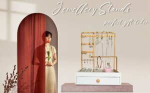 White Jewellery Stand for Necklaces with Large Storage Wooden Drawers. Gold Metal Jewellery Tree Hanging Earring,Necklaces, Bracelet, Ear Studs, Ring. Perfect Girls Woman Gif