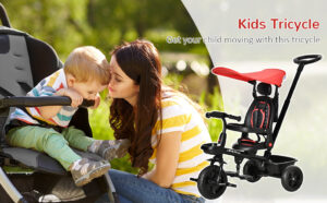 HOMCOM 4-in-1 Kids Tricycle Toddler Trike w/ Reversible Angle Adjustable Removable Seat Adjustable Handle Canopy Handrail Belt Storage Footrest Ages 1-5 Years – Red
