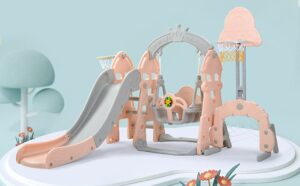 5 in 1 Kids Slide and Swing Set Playset Activity Center with Basketball Hoop Height Adjustable & Soccer Goal Toddler Climber Playground Indoor Outdoor Exercise Toy (Pink)