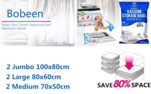 Bobeen Vacuum Storage Bags, 6 Pack (2 Jumbo + 2 Large + 2 Medium) Double-Zip Seal for Clothes, Duvets, Bedding, Pillows, Mattress, Quilt, Sweaters, Dress, Coats, Curtains, Blankets