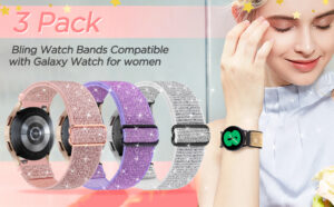 ABOVEACC Bling Strap Compatible with Samsung Galaxy Watch 5 40mm 44mm/ Watch 5 Pro 45mm/ Galaxy Watch 4 Classic 42mm 46mm/ Samsung Watch 4 40mm 44mm, 20mm Elastic Nylon Strap for Women Girls, 3 Packs