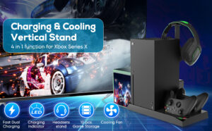 Vertical Cooling Stand with Cooling Fan for Xbox Series X Console & Controller,Accessories with 2x1400mAh Rechargeable Batteries and Dual Controller Charger Dock Station&Headset Holder&10 Game Slots