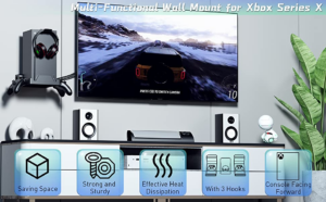 for Xbox Series X Wall Mount, JulyTek 4 in 1 Wall Mount Bracket for Xbox Series X with 2 Controller Holder & Headphone Hook , Integrated and Heat Ventilation Design, Mount XSX Facing Forward