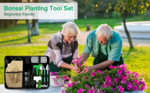 Arrinew Bonsai Planting Tools Set 26 Pcs Gardening Planting Tools Kit Include 2 Planting Bags, U-Shaped Shears, Mini Rake, Round and Pointed Shovel &Training Wire in PU Leather Bag ect.