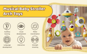 Pram Toys for Babies – Musical Infant Car Seat Toys, Baby Crib Toys with Music Box, Foldable Pushchair Toys Stroller Hanging Montessori Sensory Toys for Boys Girls Newborn Shower Gifts